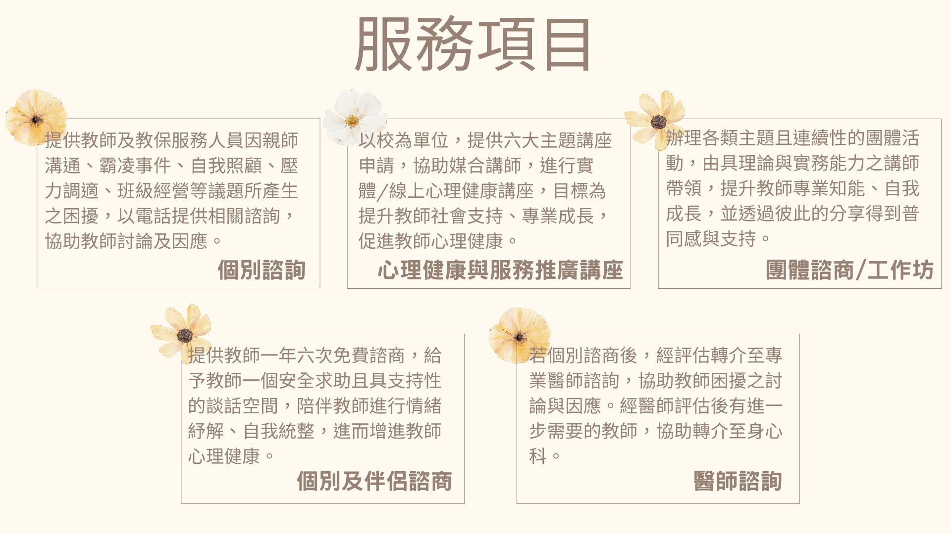 提供每位教師一年六次免費諮商,給予教師一個安全求助且具支持性的談話空間,陪伴教師進行情緒紓解、自我統整,進而增進教師心理健康。